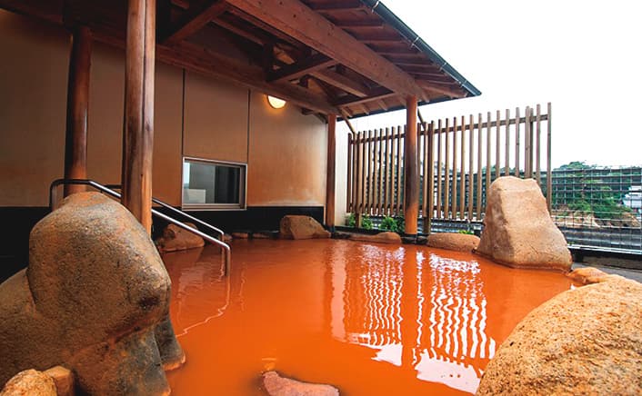 鳩子の湯は、県内唯一の含鉄泉で茶褐色のお湯がインパクト大。体がぽかぽかに温まり、保温効果も持続するので、冷え性の方におすすめです。