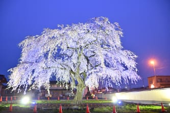 寺の境内に咲く、推定樹齢300年、樹高約12メートルにおよぶ道内最大級のしだれ桜。春の陽光に照らされ大きく枝ぶりを広げる勇壮な姿から一変、イベント期間中にライトアップされる幻想的で妖艶な夜桜も見ものです。