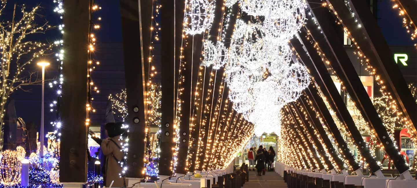 JR函館駅前広場に施される函館山とイカ釣り漁の漁火をイメージした冬限定のイルミネーション。外側には海を思わせるブルーの灯りが輝き、キラキラと華やかなアーチをくぐると動きに合わせて光が変化する演出もあります。