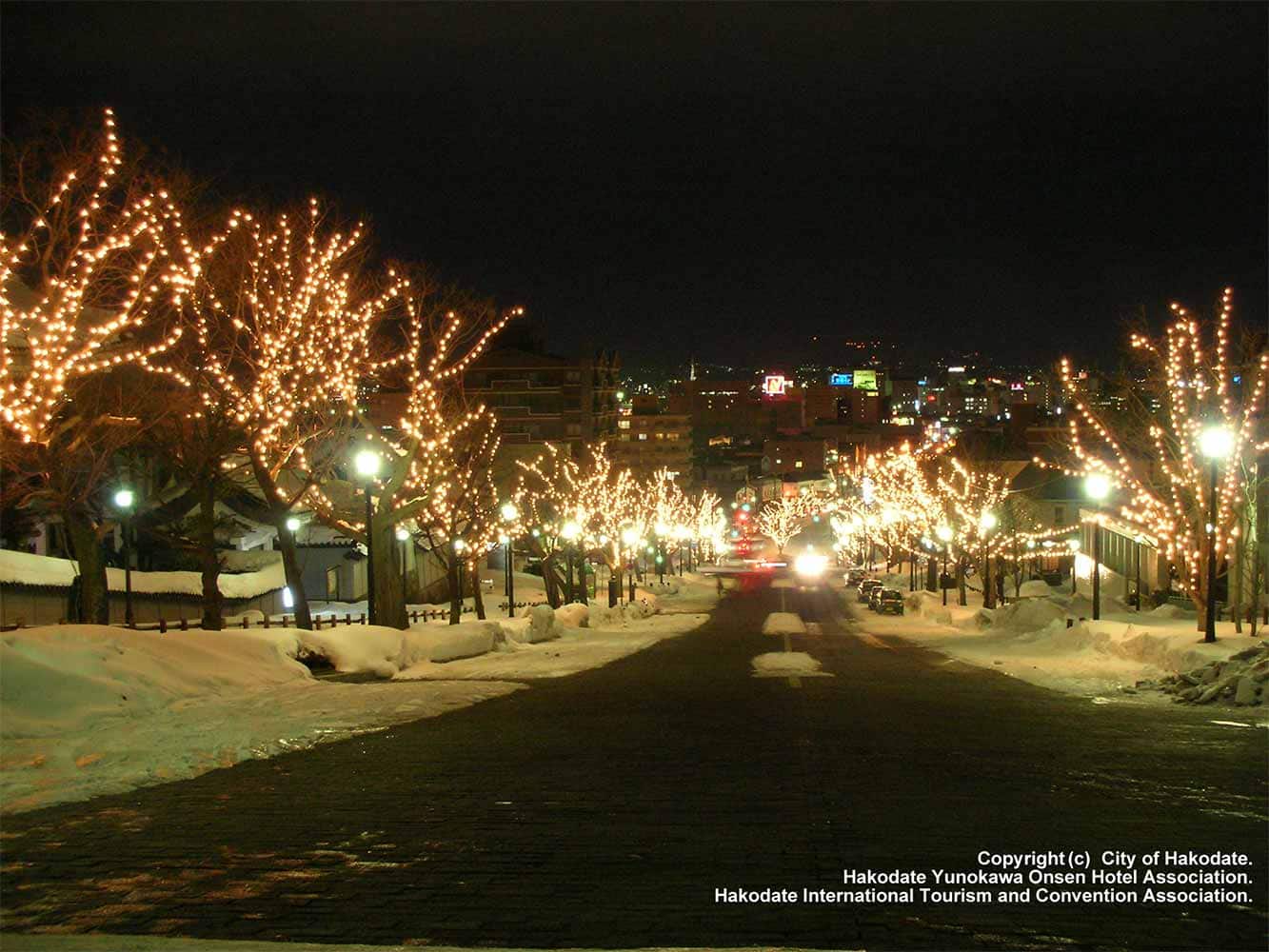 歴史的建造物や教会が並ぶ西部地区がイルミネーションで彩られる「はこだて冬フェスティバル」のメインイベント。八幡坂と二十間坂、はこだて明治館前の開港通りの街路樹がライトアップされ幻想的な光の回廊が生まれます。