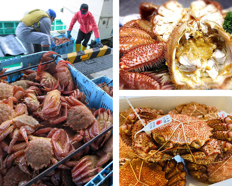 北海道周辺で水揚げされるカニは、ズワイガニ・毛ガニ・タラバガニが代表的ですが、これをいわゆる「三大ガニ」と呼んでいます。紋別では三大ガニすべてが水揚げされています。