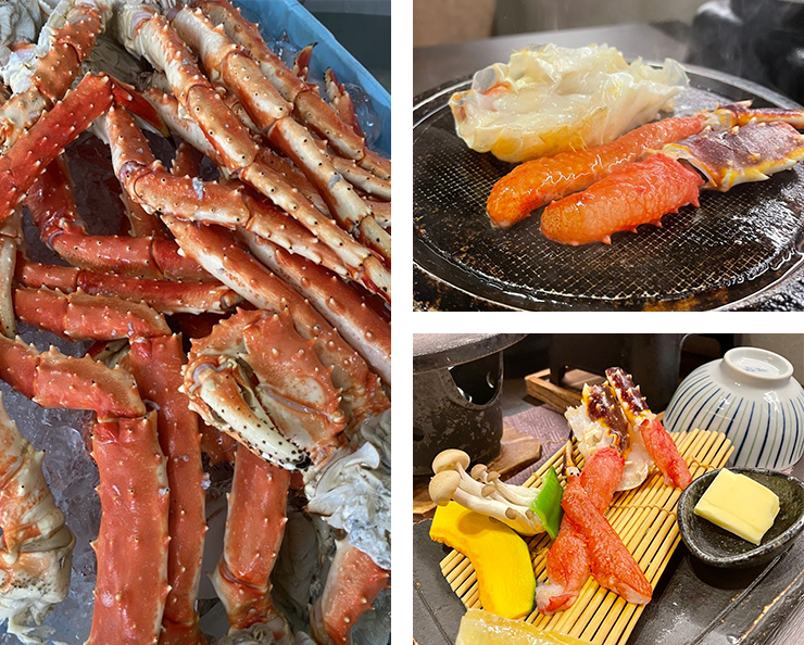 「タラバガニ」は、カニの名がついていますが、カニは5対、10本の脚があるのに対し、タラバガニやハナサキガニは外見上4対、8本の脚しかなく、ヤドカリの仲間に分けられています。水揚げされる時期は4月から9月までで、沖合底引き網や刺網で獲られています。身は太く食べごたえがあり、プリプリとした食感が特徴です。