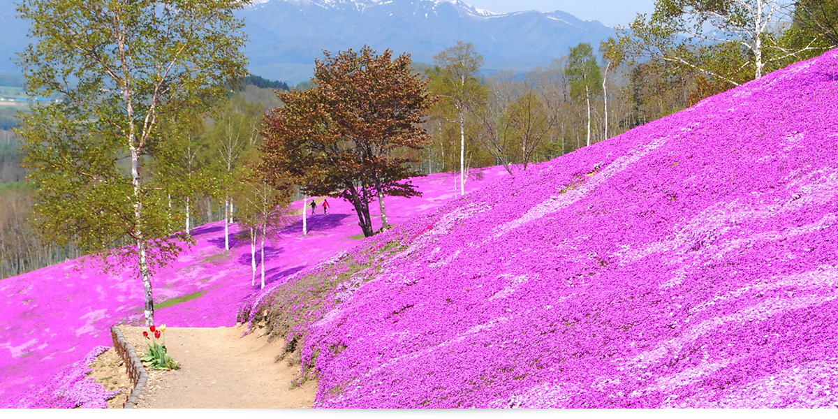 」に咲き誇る芝ざくら。ミカン箱ひとつ分の苗からスタートした芝ざくらは、60年以上かけて日本最大級の10万平方メートルの大群落になりました。斜面一面に広がる芝ざくらはまさに圧巻の一言。ぜひ一度は見ていただきたい滝上町を象徴する景色です!