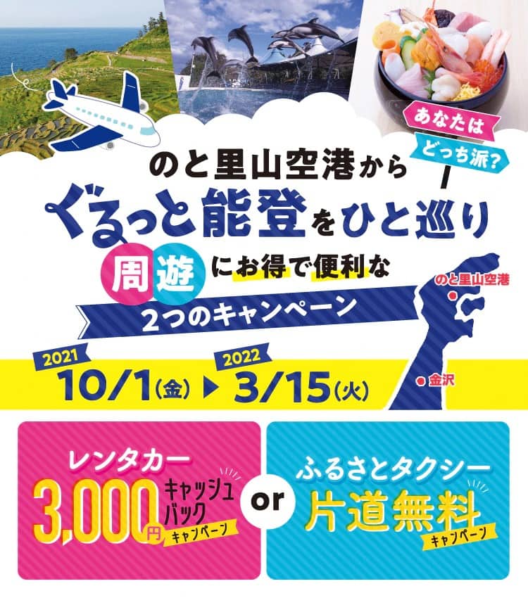 お問い合わせの際は、「のと里山空港 お得なレンタカーorふるさとタクシーキャンペーン」とお申し出ください。