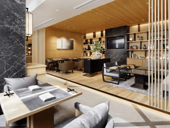 広々としたフロアと落ち着いたインテリアが演出する洗練された空間で、ご出発前のひとときをゆったりとおくつろぎください。