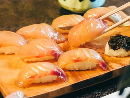 島ずしは、近海で獲れた旬な魚の寿司種を醤油ベースのタレに漬けてヅケにし、シャリはやや甘めの酢飯で握り、ワサビの代わりにカラシを載せてあるのが特徴の郷土料理です。八丈島では各家庭で、また冠婚葬祭にも欠かせない食事として継承されてきました。スーパーでもお手頃価格で販売されており、八丈島空港内でも寿司折として人気のお土産となっています。