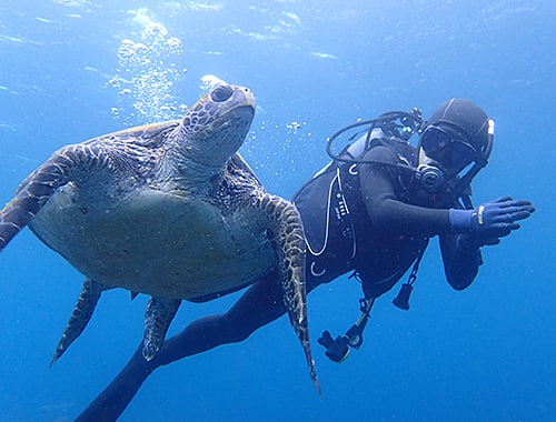 島の周辺海域全てがダイビングポイントとも言える八丈島。溶岩が生み出した海底アーチなど独特の地形も相まって、海の中には幻想的な世界が広がっています。「八丈ブルー」と形容される海は、コンディションの良い時には透明度50メートルを誇ります。