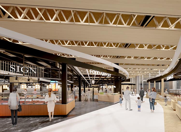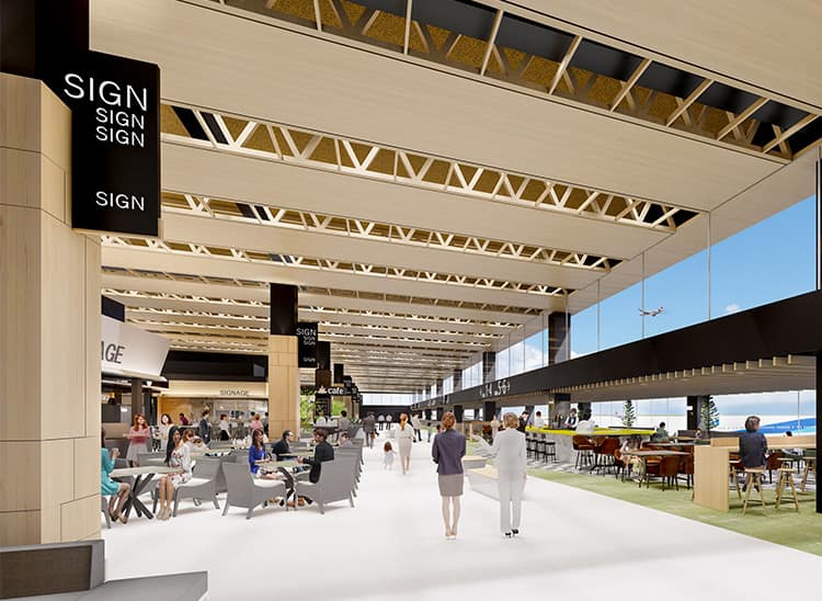 県産木材がふんだんに使われたデザイン性の高い空間で快適な時間が過ごせる、充実した搭乗待合エリアを整備。保安検査後のエリアのため、搭乗間際までショッピングやグルメを楽しむことができます。