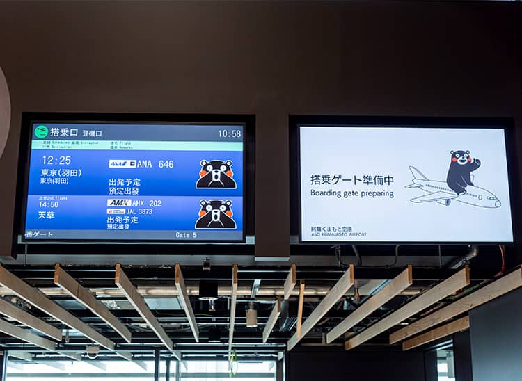 保安検査場機器は「スマートレーン」を設置。待ち並び時間が短縮できます。フライトインフォメーションシステムではくまモンが表情でお知らせします。