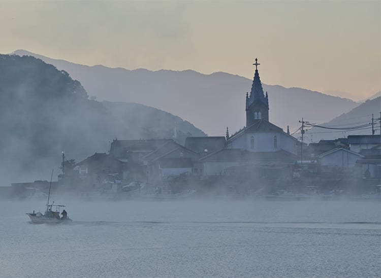 キリスト教の潜伏期から復活期の足跡が残る﨑津集落は、「長崎と天草地方の潜伏キリシタン関連遺産」の構成資産のひとつです。穏やかな羊角湾のそばに建つことから「海の教会」とも呼ばれています。