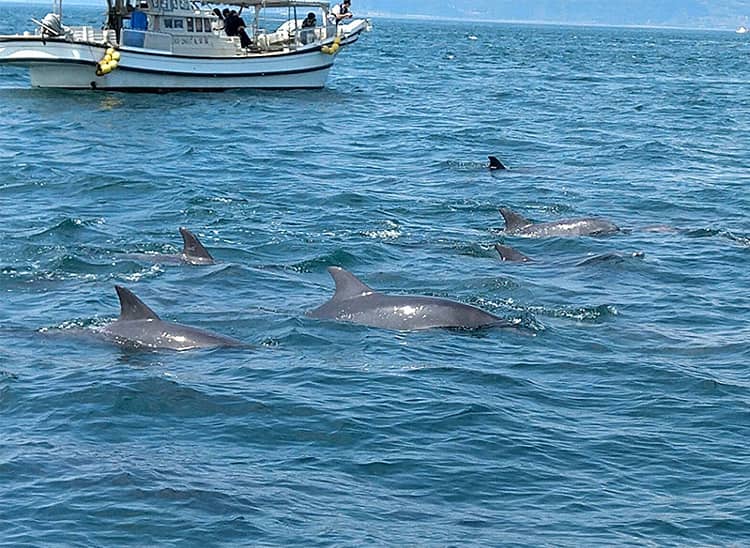 天草市五和町二江の周辺海域に生息する、約200頭の野生のミナミハンドウイルカに会える天草屈指の人気レジャーです。イルカウォッチングは一年を通して可能で、遭遇率は9割以上。