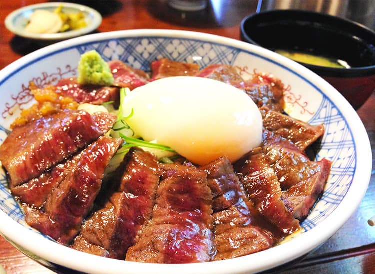 熊本・阿蘇の雄大な自然の中で育った和牛・あか牛を贅沢に使用した、その旨みを手軽に味わえる丼ぶりです。ミデイアムレアに焼かれたあか牛ステーキのスライスがご飯の上に贅沢に敷き詰められています。