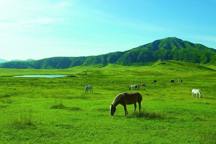 阿蘇山を代表する観光地のひとつ。標高約1,100mの高さにあり、放牧された馬が悠々と歩く姿や、噴煙を上げるダイナミックな阿蘇中岳が見渡せる絶好のロケーションです。