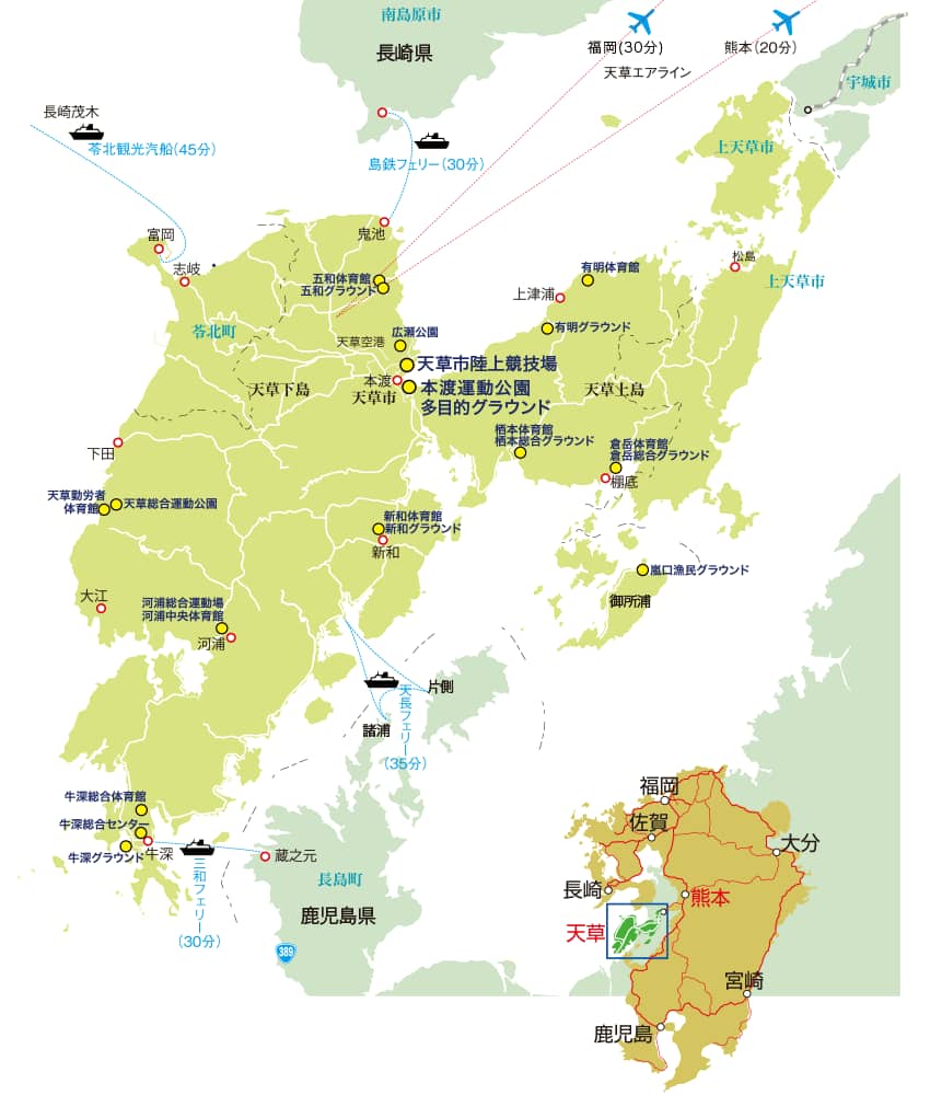 天草市は、豊かで美しい自然景観と温暖な気候に恵まれ、美味しい食事(海の幸、山の幸)や魅力ある観光地、温泉施設を有しています。市内にはスポーツ大会が可能なスポーツ施設が全域に点在しており、合宿に最適なお宿も市内全域に在ります。