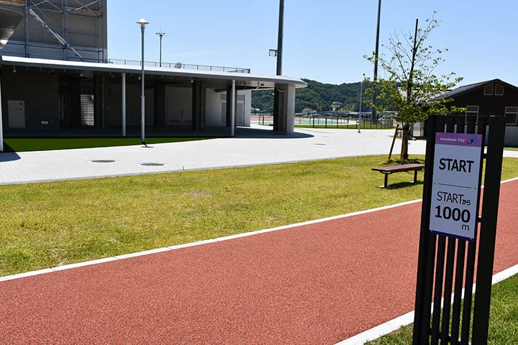 ウォーキングやランニングができる1周1kmのゴムチップ舗装の周回コース