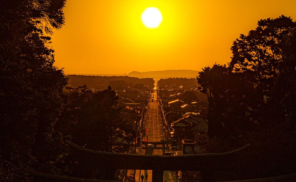 宮地嶽神社から玄界灘を通じて相島まで、夕陽によって一直線につながる「光の道」。この世とあの世が一直線で結ばれる特別な日として大切にされています。この光景は1年のうち2月下旬と10月下旬だけの「奇跡の絶景」として、国内外から多くの参拝客が訪れます。