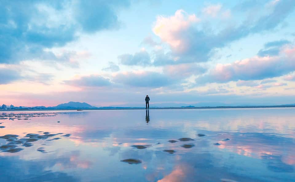 約3kmにわたって広がるビーチに、大潮~中潮の干潮時だけ現れる壮大なリフレクション。フラットな砂浜が鏡のように空や人を映し出し、幻想的な写真が撮影できるフォトスポットとして人気です。かがみの海が出現するビーチエリアには個性豊かなカフェやレストランも並び、ゆったりとした時間を過ごすことができます。
