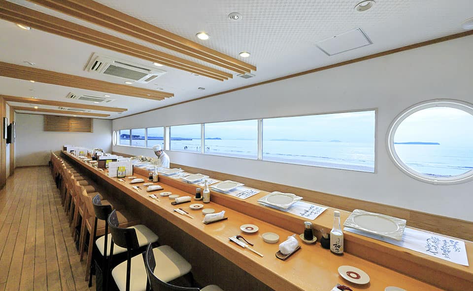 グランピングやレストランが集まる福間海岸の複合施設「ぶどうの樹 海岸通り」の一角。全席海を向くカウンターでいただくのは、寿司職人が握る鮮度抜群の本格寿司です。目と舌とで玄界灘を味わい尽くす、贅沢な時間をお過ごしください。