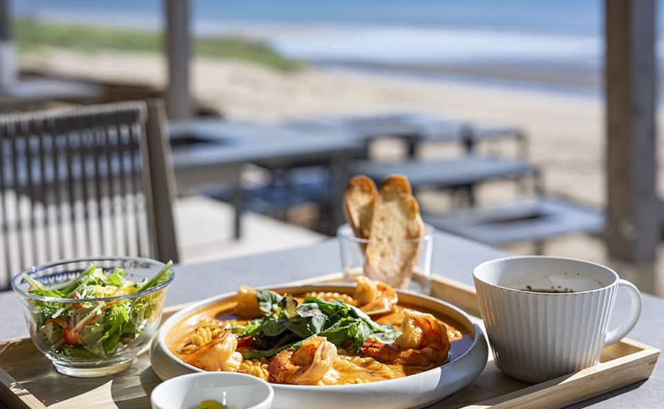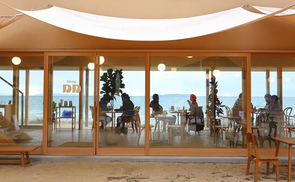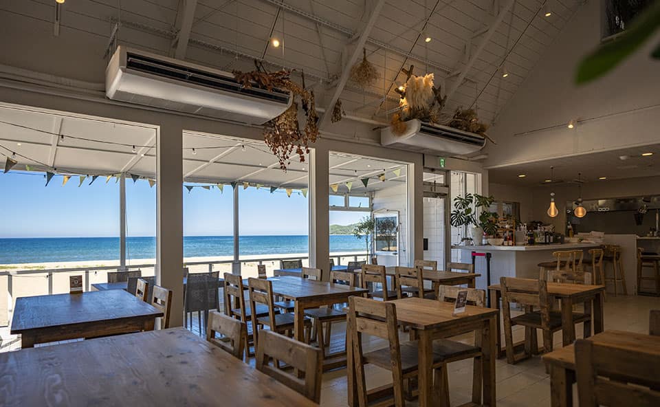 福間海岸でひときわ目を引く白い三角屋根のカフェレストラン。ビーチに面したテラス席や7mの吹き抜けがリゾート気分を盛り上げます。2階には水平線を眺めながらリラックスできるプライベートサウナも完備。さらに、仲間と楽しむBBQも人気で、特別なひとときを過ごせるスポットです。