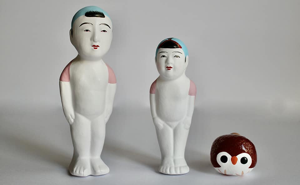 福津市津屋崎で240年続く郷土玩具「津屋崎人形」の歴史を受け継ぐ唯一の工房。丸くて愛らしい「モマ笛」やシュールな表情がたまらない「ごん太」などに魅了され、全国から足を運ぶ人も多いスポットです。店内では絵付け体験も楽しめ、自分だけの「モマ笛」を作ることができます。
