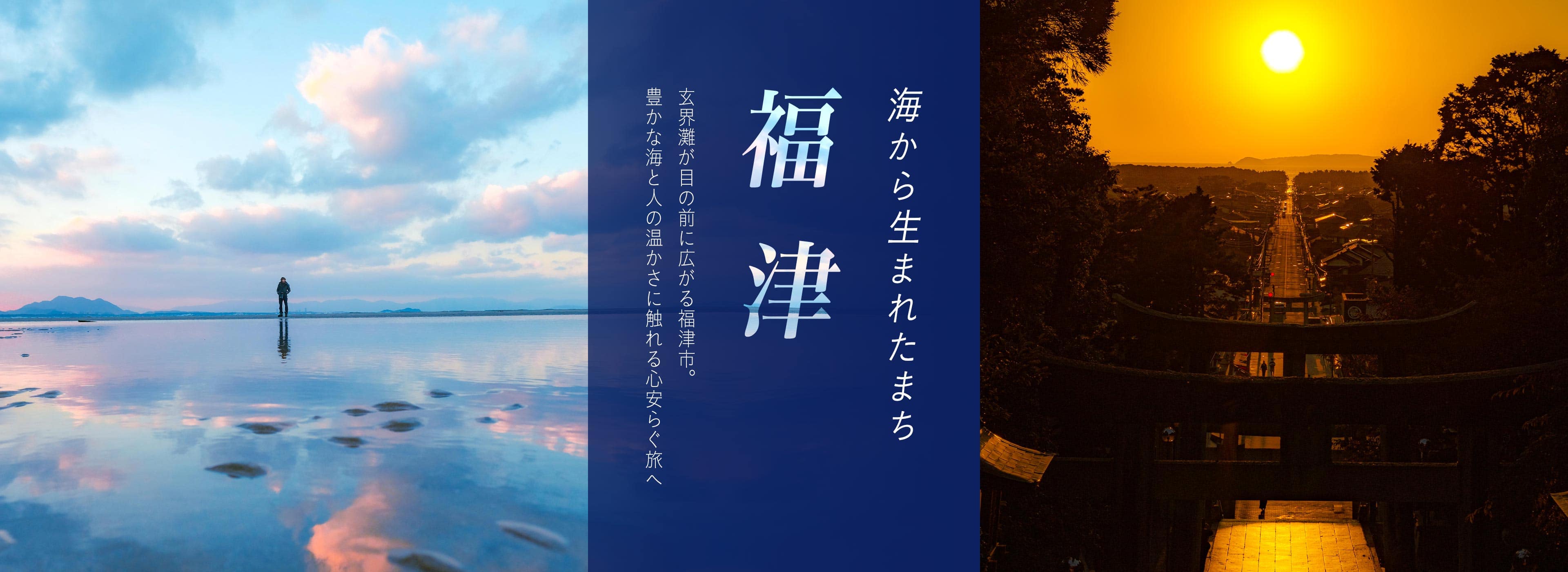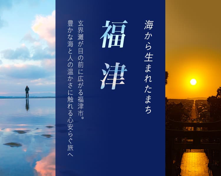 福岡県福津市は、福岡と北九州の中間に位置し、人口約69,000人のまちです。住む人や訪れる人に「幸福(福)」を届け、多くの人々が集まり交流する「港(津)」のような街でありたいという願いのもと、旧福間町と旧津屋崎町が合併して誕生しました。福岡市からのアクセスも良く、何事にも打ち勝つ開運の神さま・宮地嶽神社の「光の道」、カフェが立ち並び年間通してサンセットが楽しめるビーチエリア、幻想的な「かがみの海」、ノスタルジックな「津屋崎千軒」など、多彩な魅力が訪れる人を惹きつけます。