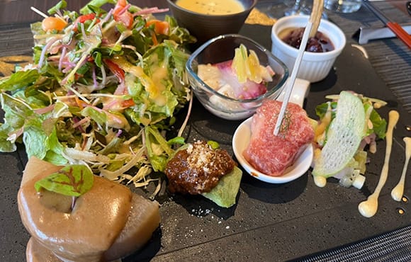 外務大臣が認定する“優秀公邸料理長”の栄誉を受けたシェフが、地産地消の新鮮な食材を贅沢に使用し、その魅力を卓越した技術で存分に引き出します。この地の文化と風土が醸し出す“テロワール”にこだわった“和モダンフレンチ”と季節のフルーツをお楽しみください。