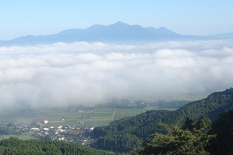 標高472メートルの金御岳は都城盆地と霧島連山を一望することができ、夜景100選にも選ばれている観望スポット。秋から春にかけては盆地特有の朝霧が発生しやすくなり、高千穂峰(霧島山)が雲海に浮かぶ島のように見える幻想的な光景を見ることができます。