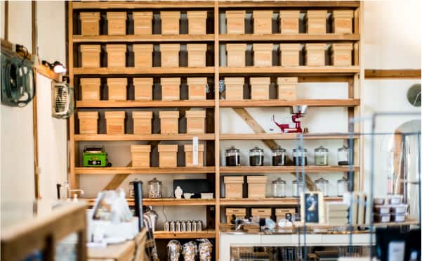 昔ながらの製法で作られた茶箱が並ぶ店内。