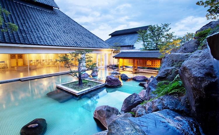 雄大な阿蘇五岳を一望する内牧温泉の老舗ホテル。遮るもののない屋上露天風呂では、2つの自家源泉からなる名湯を独り占め。阿蘇の旬を味わう会席料理も自慢です。絶景と温泉、美食に癒される時間をお過ごしください。