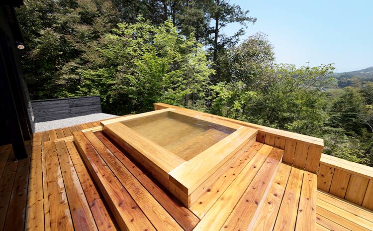 7タイプあるお部屋は、すべてに源泉掛け流しの温泉ビューバス付き。