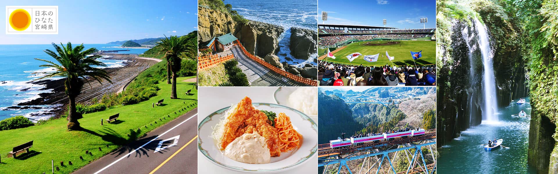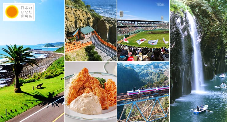 左:堀切峠、中央左上段:鵜戸神宮、中央左下段:チキン南蛮、中央右上段:サンマリンスタジアム、中央右下段:あまてらす鉄道、右:高千穂峡