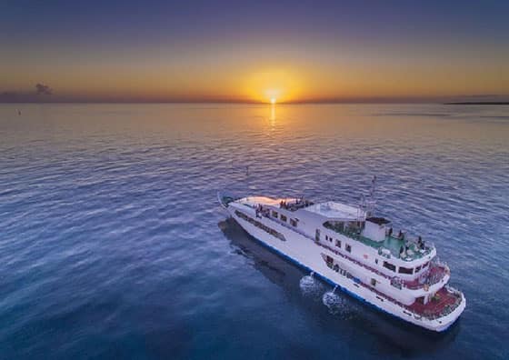 宮古島の輝く海を大型客船「モンブラン」でディナークルーズを満喫!船上からの眺めだけではなく、ボトムデッキのアクアラウンジからは海中の様子も楽しめます。