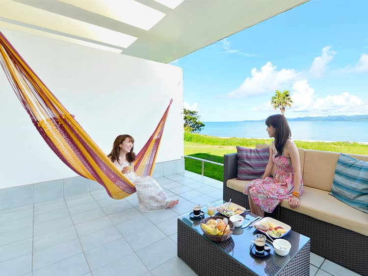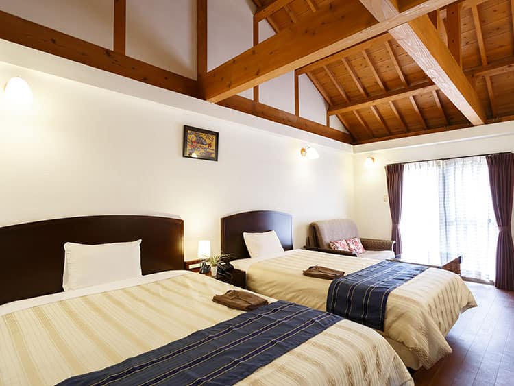 赤瓦、木造のコテージタイプのホテルです。客室の壁には沖縄の伝統素材「琉球漆喰」を使用しています。緑豊かな自然と文化の残る美しい「タケトミ」。普段の生活から抜け出し、開放感溢れる癒しのひと時をお過ごしください。