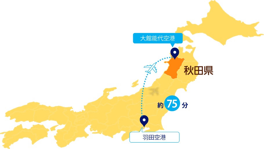 羽田空港から大館能代空港までひとっとび、飛行機で約75分。
