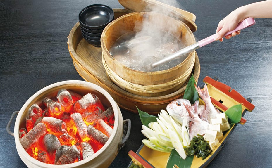 男鹿名物「石焼料理」は昔から伝わる漁師飯です。木桶の中に真っ赤に熱したアツアツの石を入れて、魚介類を瞬時に煮る豪快な調理法が特徴。大きな音をたて、一気に湯気が吹き上がる瞬間は、見逃せません。新鮮な魚介類のダシが効いた味噌味のスープは格別です。