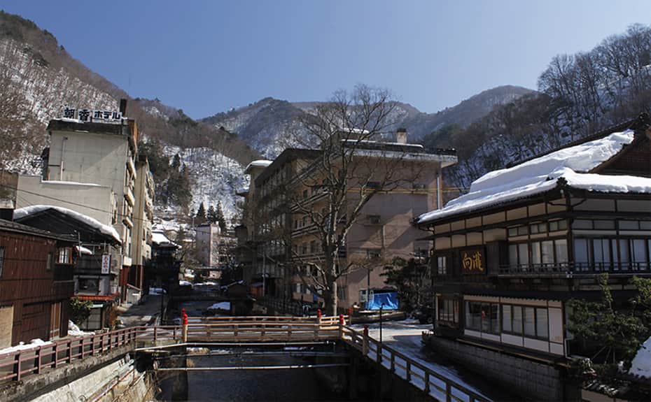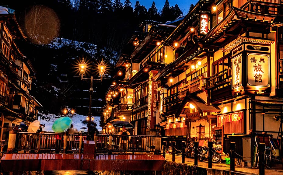 銀山温泉は山形県の北東、尾花沢市にあります。すいかの生産地や花笠踊り発祥地として知られる尾花沢市ですが、何といっても有名なのが、山形を代表する名湯、銀山温泉。1600年代にこの地が銀山として栄えたことからこの名が付きました。1900年初頭に建てられた木造の旅館が小さな川の両岸に沿って並ぶ温泉街は情緒たっぷりです。