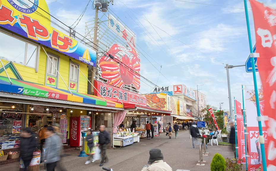 新潟県の中央に位置する長岡市寺泊は日本海に面した国道402号線沿いに、通称「魚のアメ横」と呼ばれる海産物市場が軒を連ねています。鮮魚店や土産物店など11店舗が並び、地元寺泊港や出雲崎港に揚がる生鮮品はもちろん、冷凍や加工品も含め新鮮で安い魚の宝庫です。