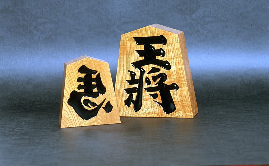 将棋駒の製造が天童で始まったのは、江戸時代末期までさかのぼります。武士の内職として奨励され手工業生産が中心でしたが、明治時代末期から機械化による大量生産が進み昭和初期には、安価で良質な天童将棋駒の供給が可能となりました。一般財団法人伝統的産業振興協会認定の伝統工芸士が作る盛上駒は、プロ棋士のタイトル戦でも使われています。