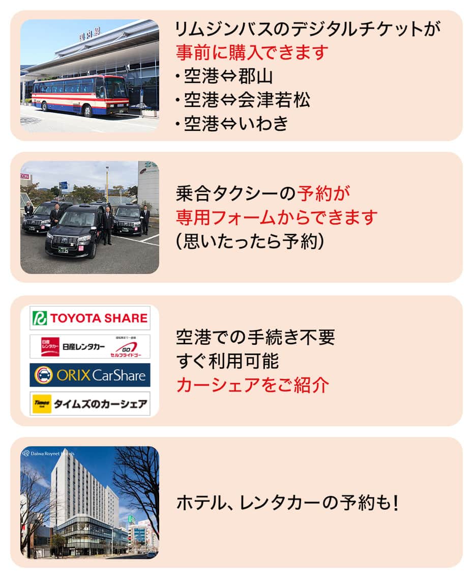 福島空港は県の中心エリアに位置しており、どこの観光地へもアクセスしやすい位置にあります。県内はもちろん、日光や那須へも行くことができます。