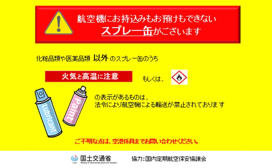 爆発の恐れがあるもの、燃えやすいもの、人に危害を与えたり、または他の物件を損傷する恐れがあるものは、法令により航空機輸送が禁止されており、お預けもお持ち込みもできません。また刃物類など「凶器」として使用される恐れがあるものは機内へのお持ち込みができません。手荷物のご準備の前にご確認ください。