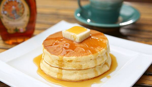 大江ノ郷自然牧場のガーデンカフェは、行列ができる人気店。お目当ては焼きたての絶品パンケーキです。「天美卵」で作る新鮮なメレンゲ生地はベーキングパウダー不要で、鳥取県産の牛乳やバターにこだわって注文ごとにふっくらと焼き上げます。