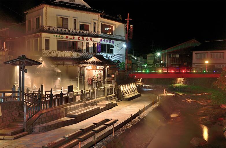 約1200年前に慈覚大師によって開湯された温泉。温泉街の中心地には「荒湯」と呼ばれる98度の熱湯が毎分470リットル湧き出ており、温泉卵や野菜を茹でるのにも使われています。温泉街の川沿いに設けられた足湯もオススメです。また、湯村温泉は1980年代のNHKドラマ「夢千代日記」の舞台として脚光を浴びました。