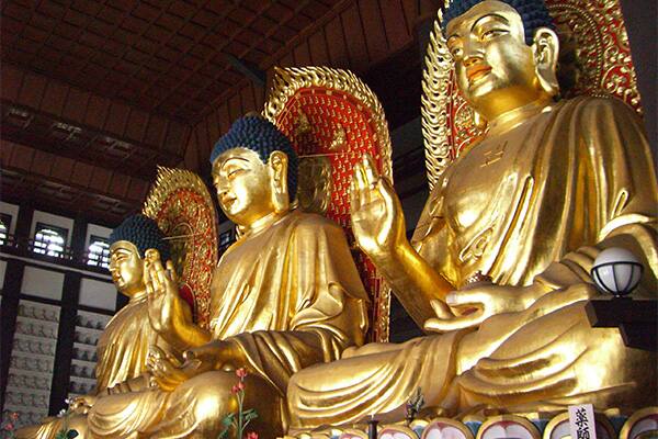 向かって左から阿弥陀如来・釈迦如来・薬師如来と三体並んだ大仏さまは、中国の仏師延べ2万人が3年の年月をかけ製作したもので132万枚もの金箔が貼りめぐらされています。