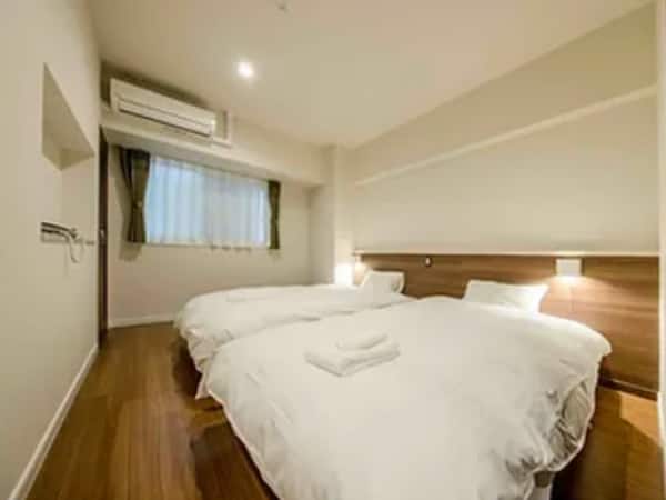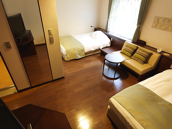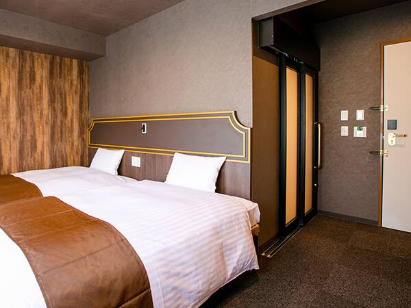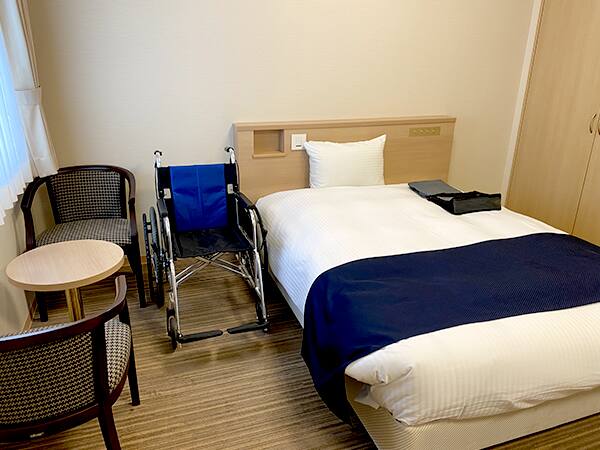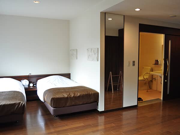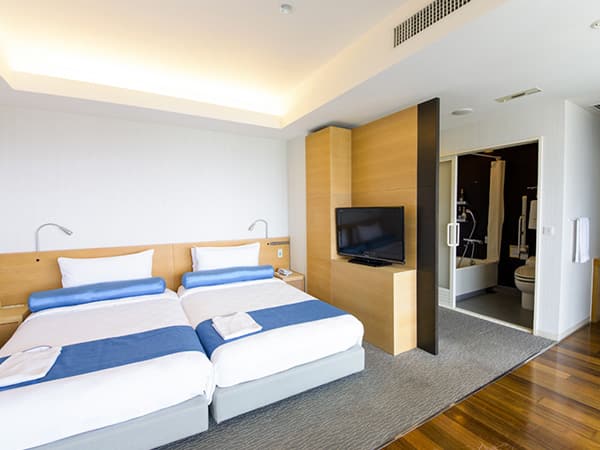 120センチ幅のセミダブルベッド2台をご用意しております。バリアフリー設計のお部屋で、車いすのお客様も快適にお過ごしいただけます。