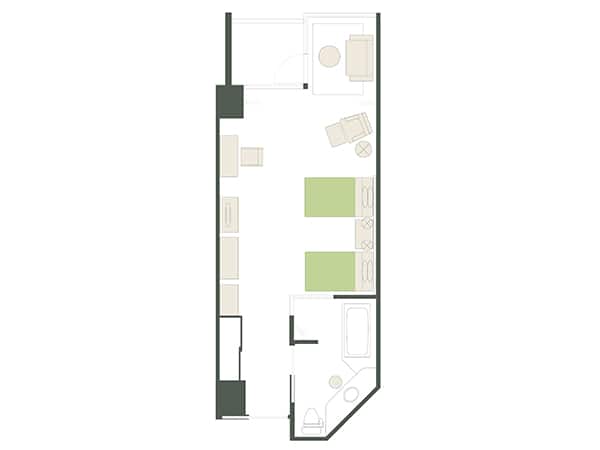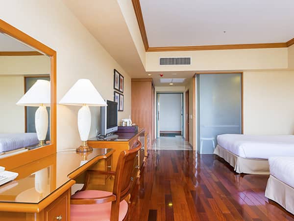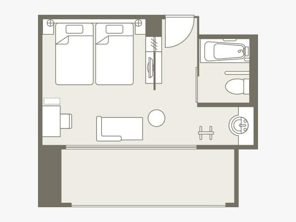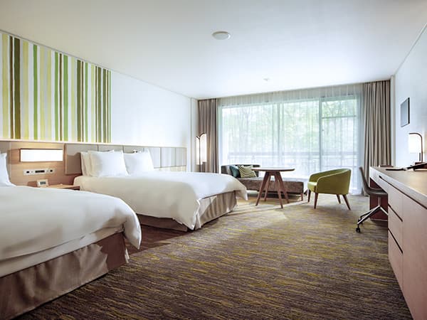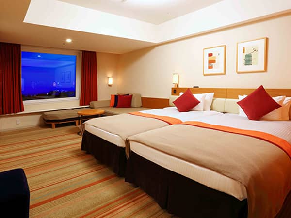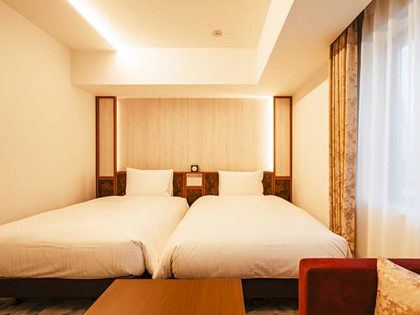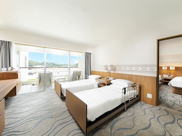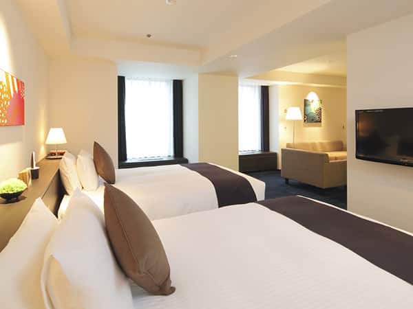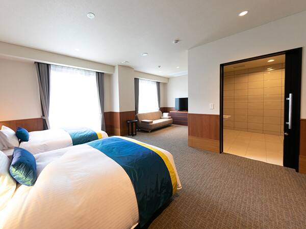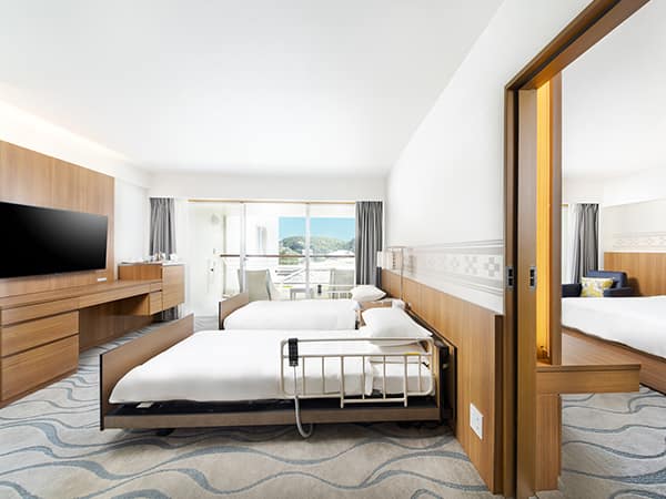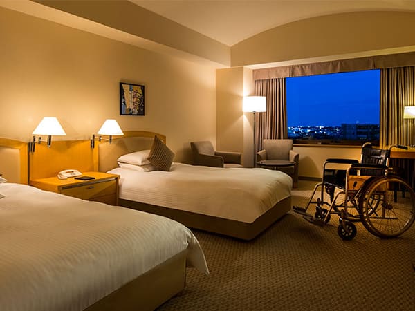 広々した49平米のお部屋に幅140cmのダブルベッドを2台備え、車いすご利用のお客様にも配慮した機能的な客室です。