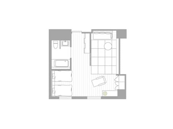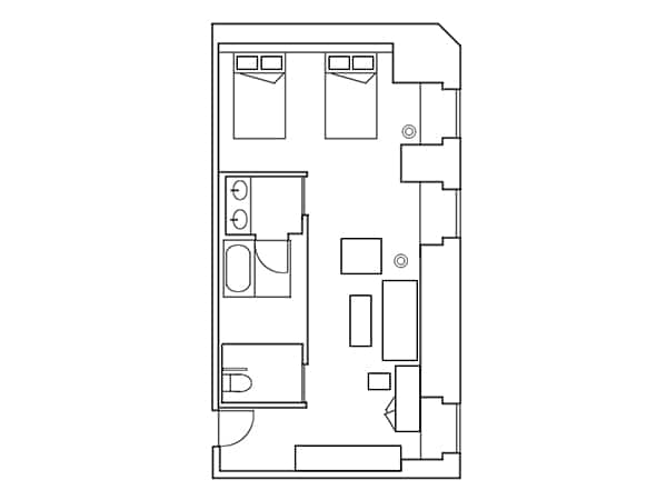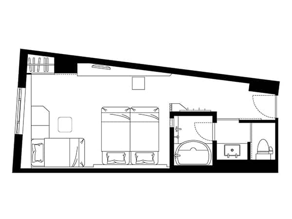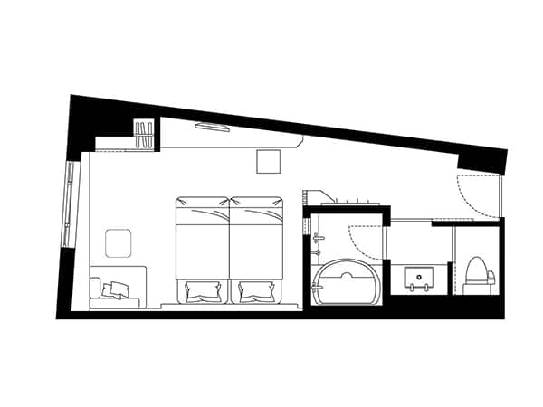客室内の床に段差はなく、洗い場付きバス・トイレ・パウダールームが独立型。トイレ・パウダールームの入口は引き戸を採用しています。ハリウッドスタイルのベッドは離したレイアウトも可能です。