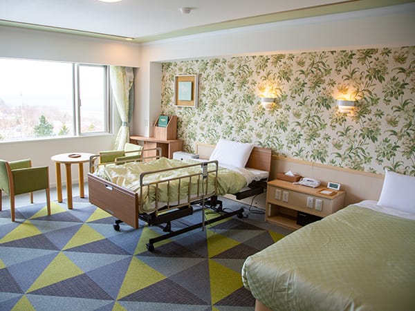 リクライニングベッド1台とシングルベッド1台をご用意した定員2名までのお部屋で、車いすでご利用いただけるトイレ・客室風呂完備しております。