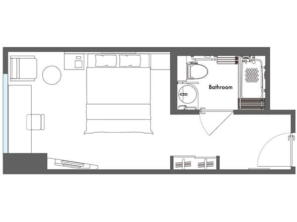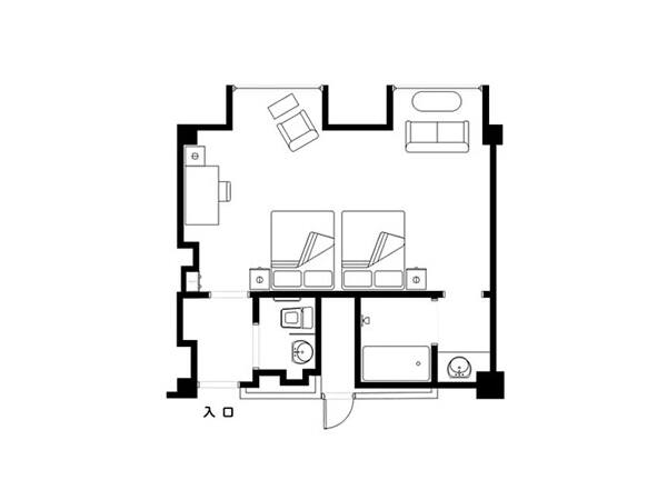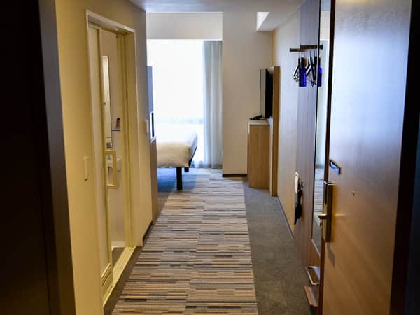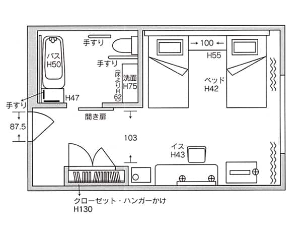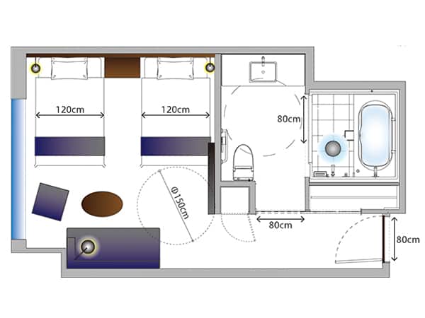 車いすをご利用の方など、全てのお客さまが快適にお過ごしいただけるバリアフリータイプのお部屋です。お部屋内は段差がなく、客室・バスルーム入口は80cm幅、お部屋の中にも転回スペースを設けております。