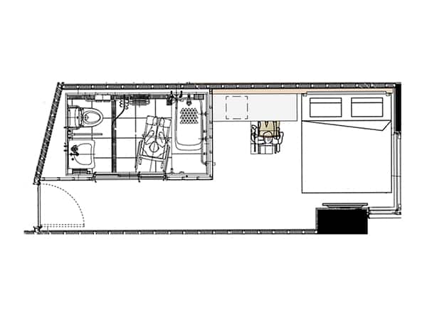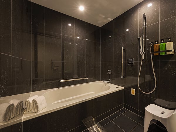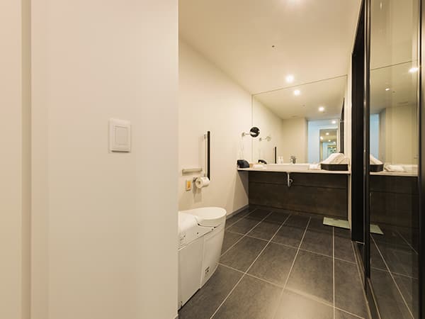 車いすご利用のお客様に快適なバリアフリーのお部屋をご用意しております。バスルームの入り口にはスライド式ドアを設置。室内の段差をなくし、それぞれの間口は通常より広く設計されています。
