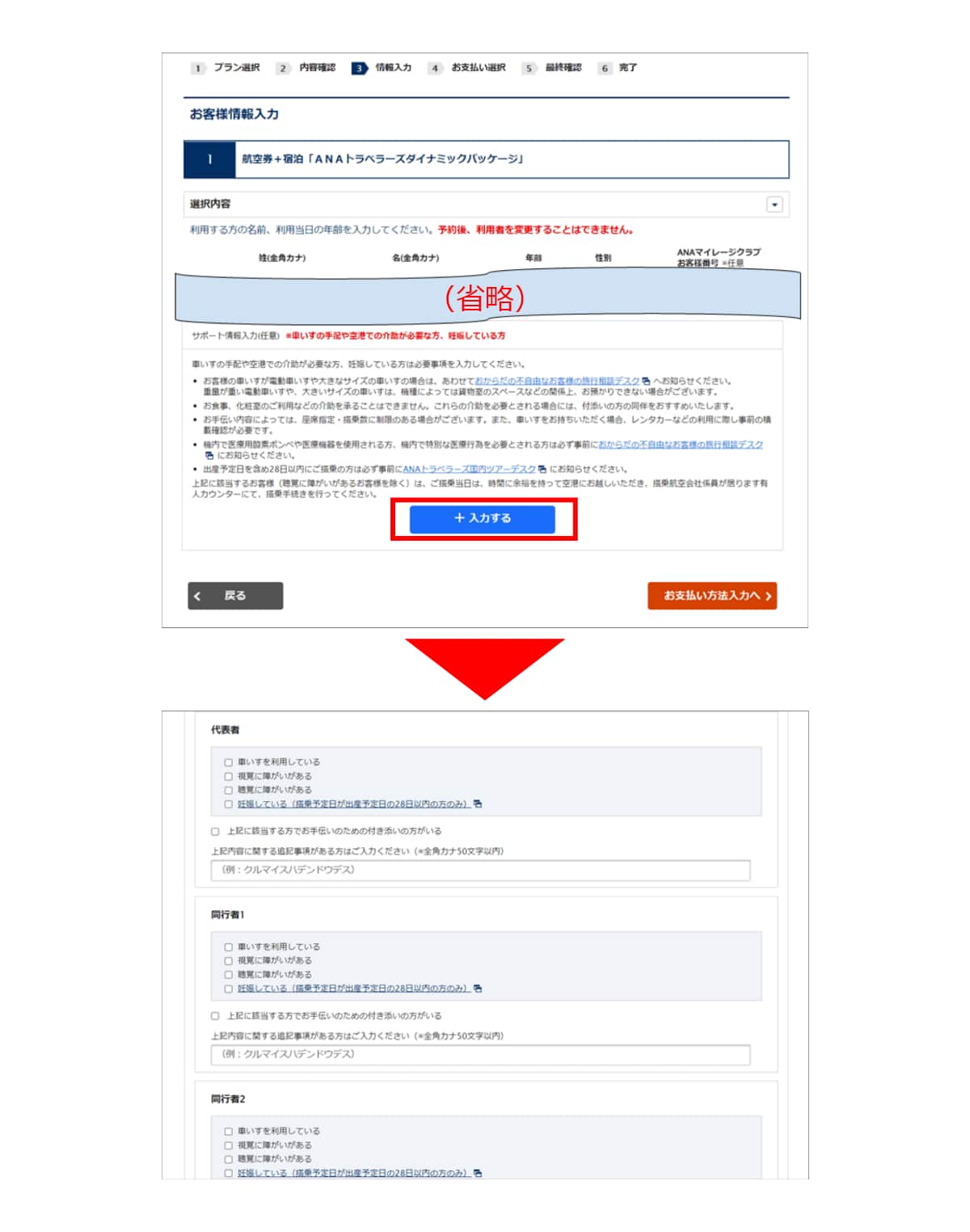 当プランについてはお客様の状況・ご要望をお伺いさせていただく場合があります。車いすのお手配や空港でのお手伝いが必要な場合は、ダイナミックパッケージでのご予約時「お客様情報入力」画面、連絡情報入力に続いて「サポート情報入力」にご登録ください。後日ご予約者さまへご連絡させていただきます。